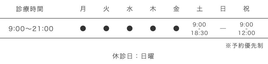 当院は朝9時から夜21時迄、待ち時間なしの予約制にて受付しております。